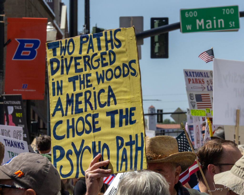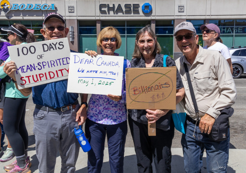 We were in Boise during two downtown protests – the No Kings and the Mayday protests. We made signs and joined the crowd of 10,000! Everyone was well behaved. One woman had a sign that said she was “Aunt-tifa.”