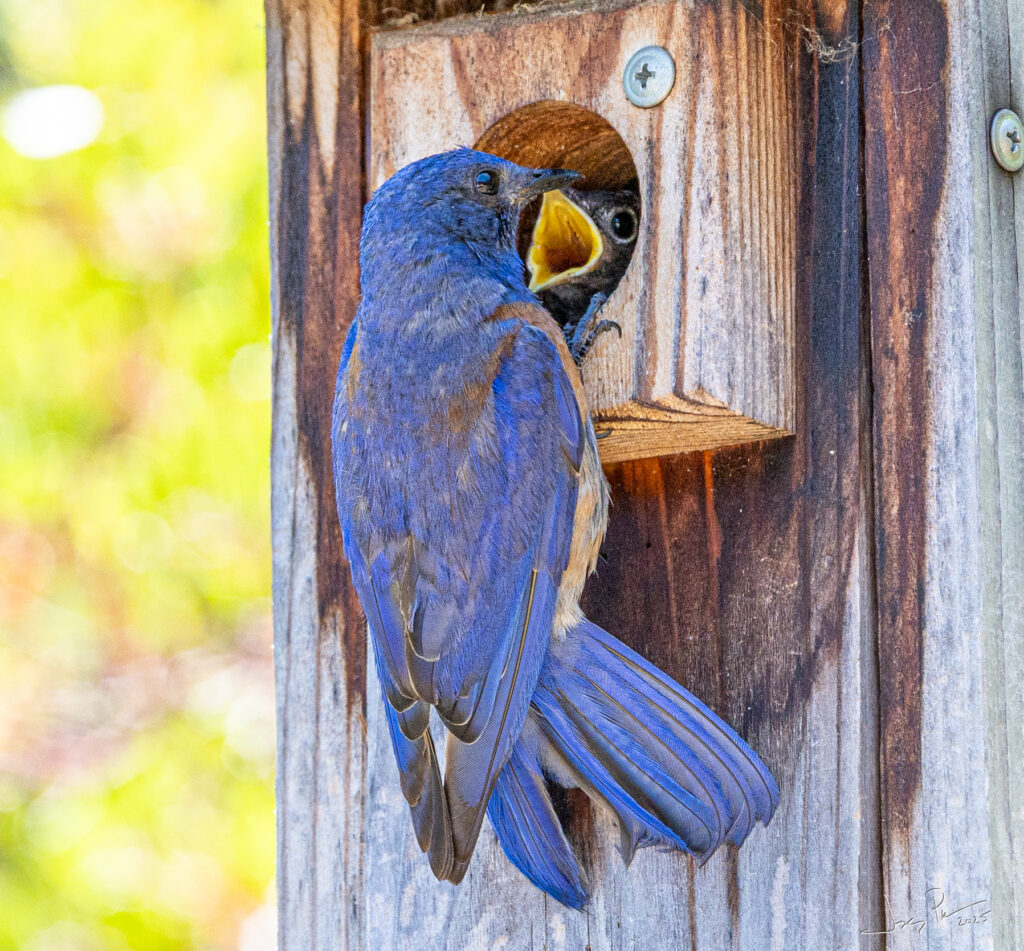 This year the main birdhouse had TWO families created: the first a Oak Titmouse and then a Bluebird family took it over.
