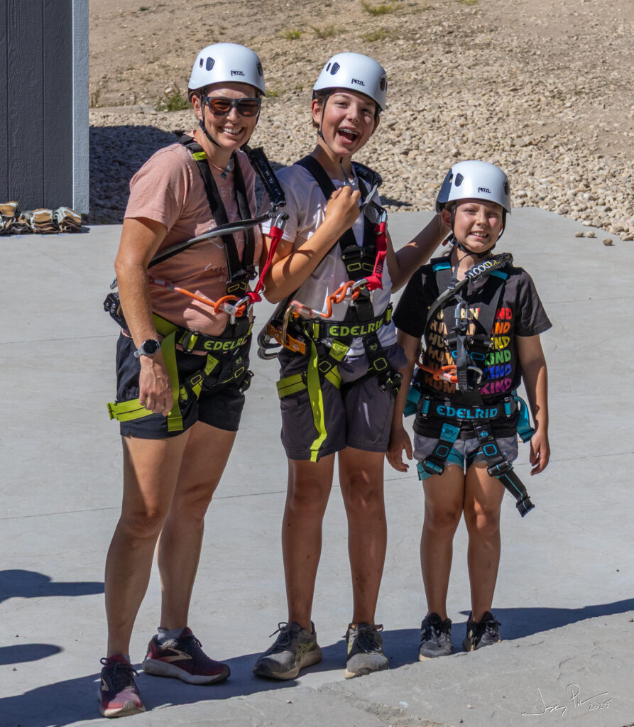 Andrea / Miles / Analiese preparing for the rope course at Bogus Basin