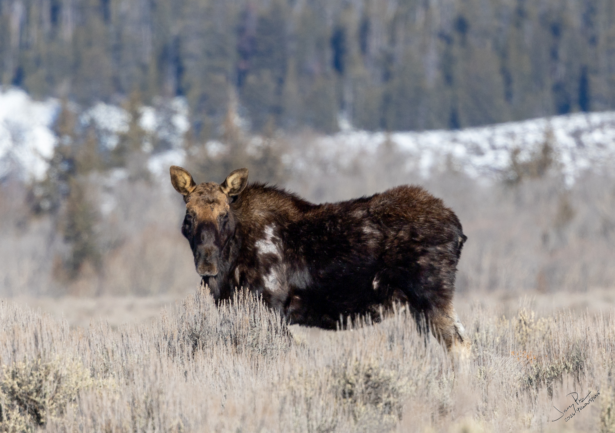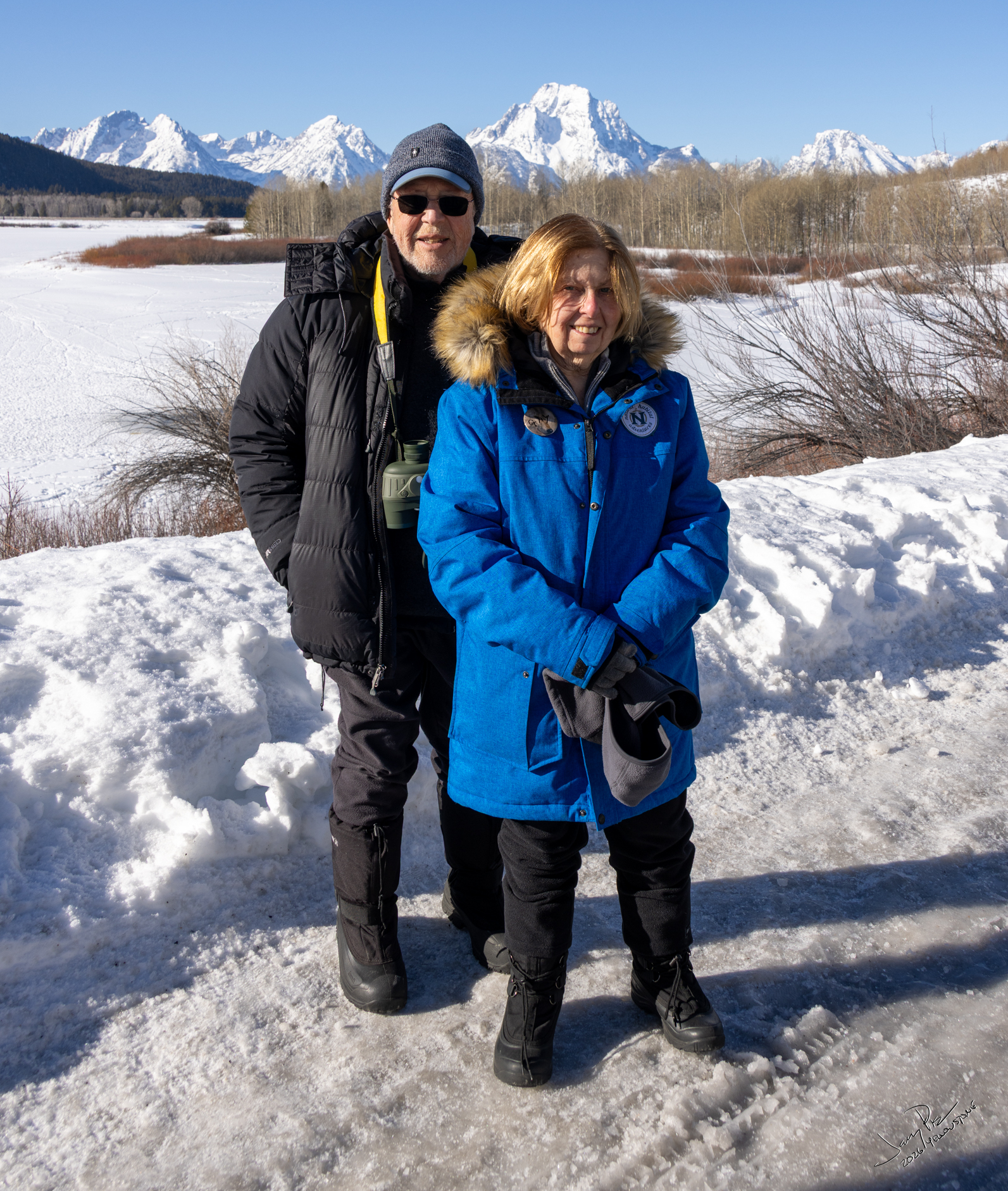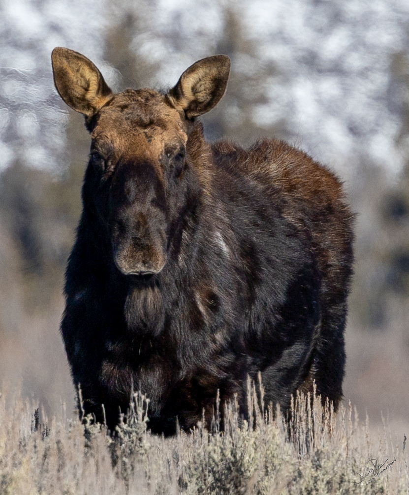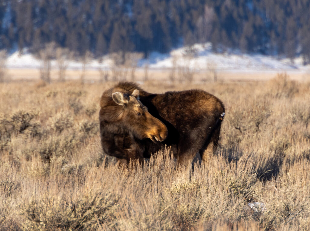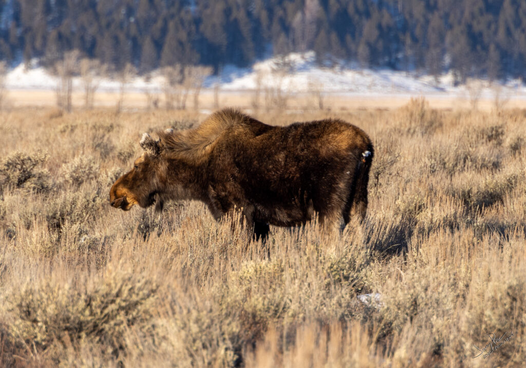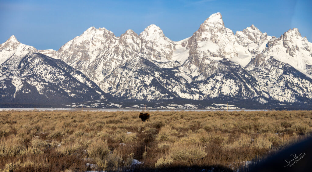 Monday we were off to the park. A fairly early departure and to the vans. We continued to look for animals and history of the park. We had a stellar clear day – unexpectedly warm – probably in the 30’s or higher! We could have expected -20° and THAT would have been cold. We saw more moose and great views of the Tetons.