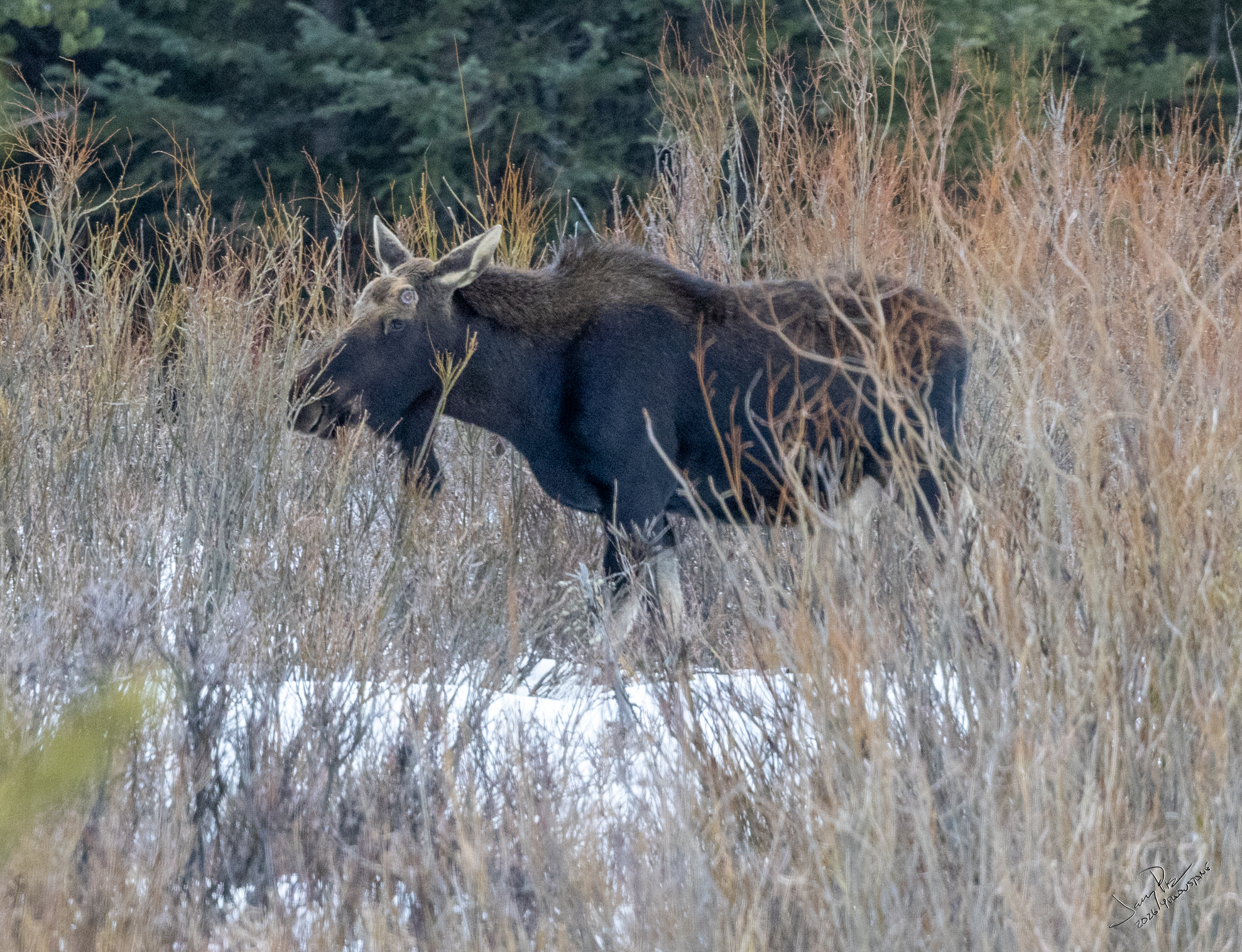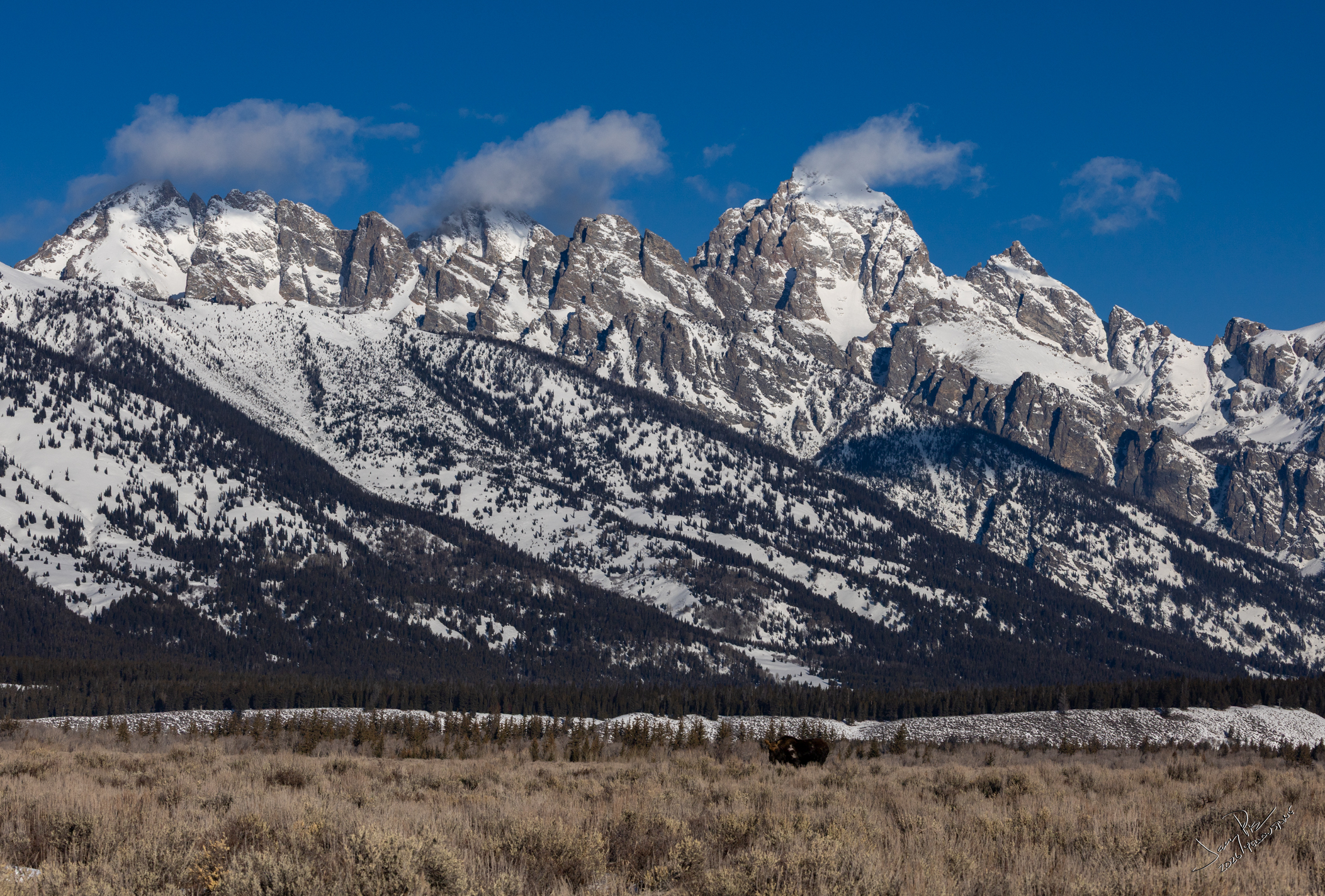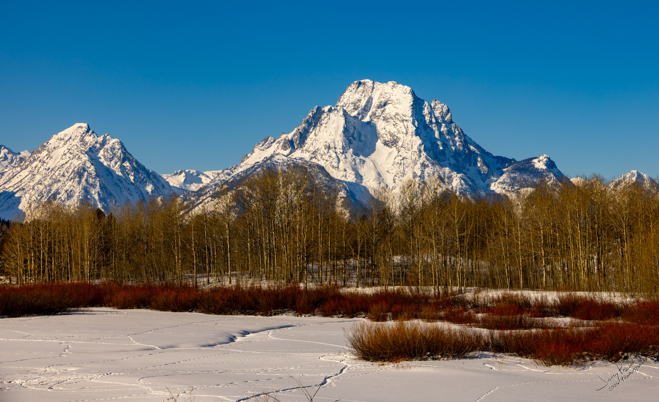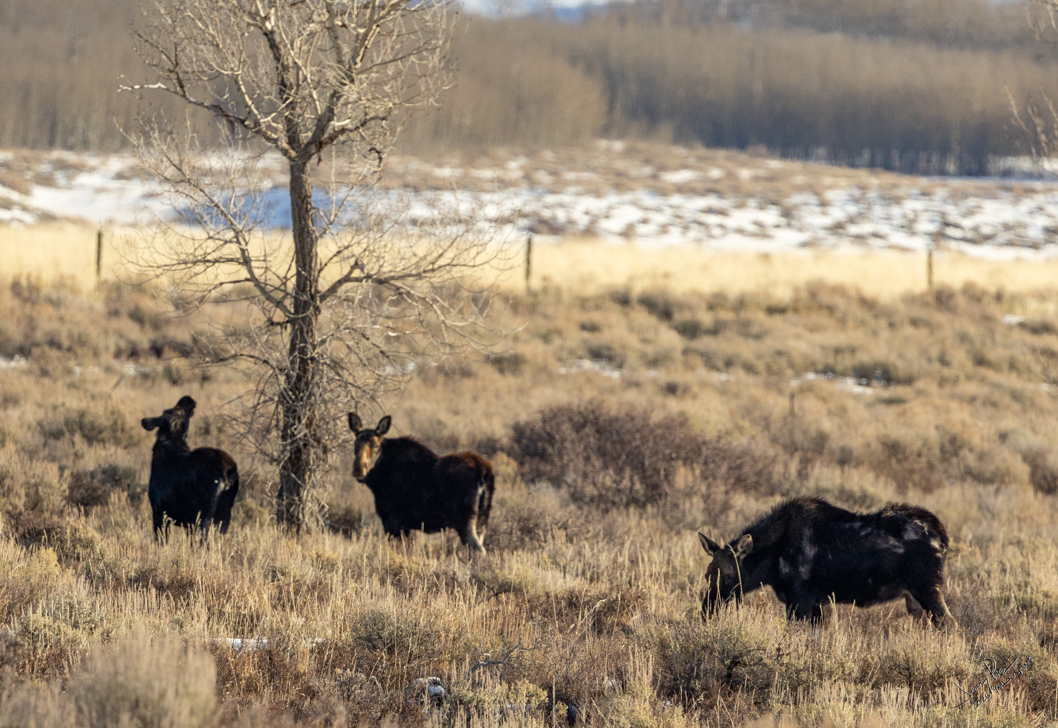 Monday we were off to the park. A fairly early departure and to the vans. We continued to look for animals and history of the park. We had a stellar clear day – unexpectedly warm – probably in the 30’s or higher! We could have expected -20° and THAT would have been cold. We saw more moose and great views of the Tetons.