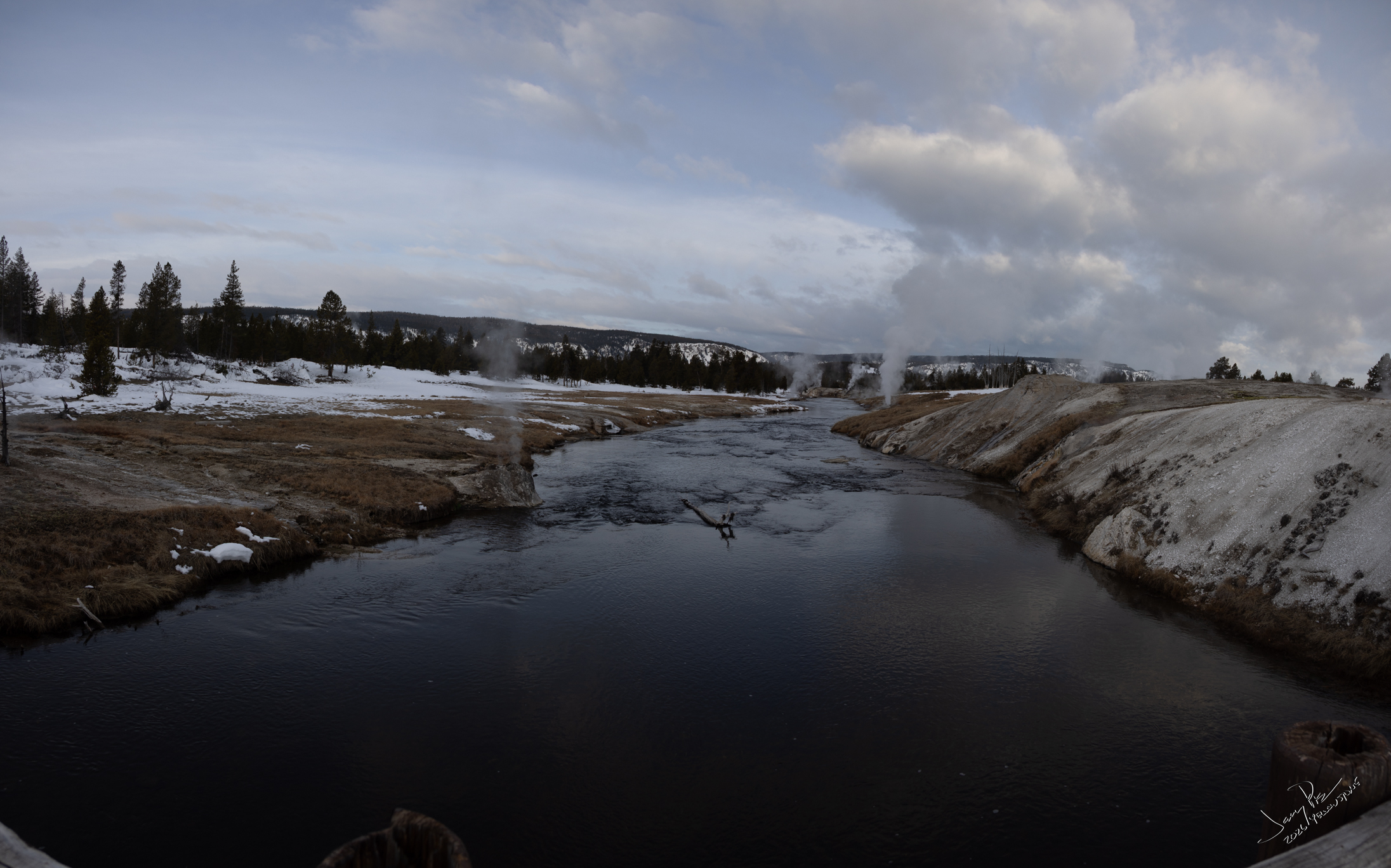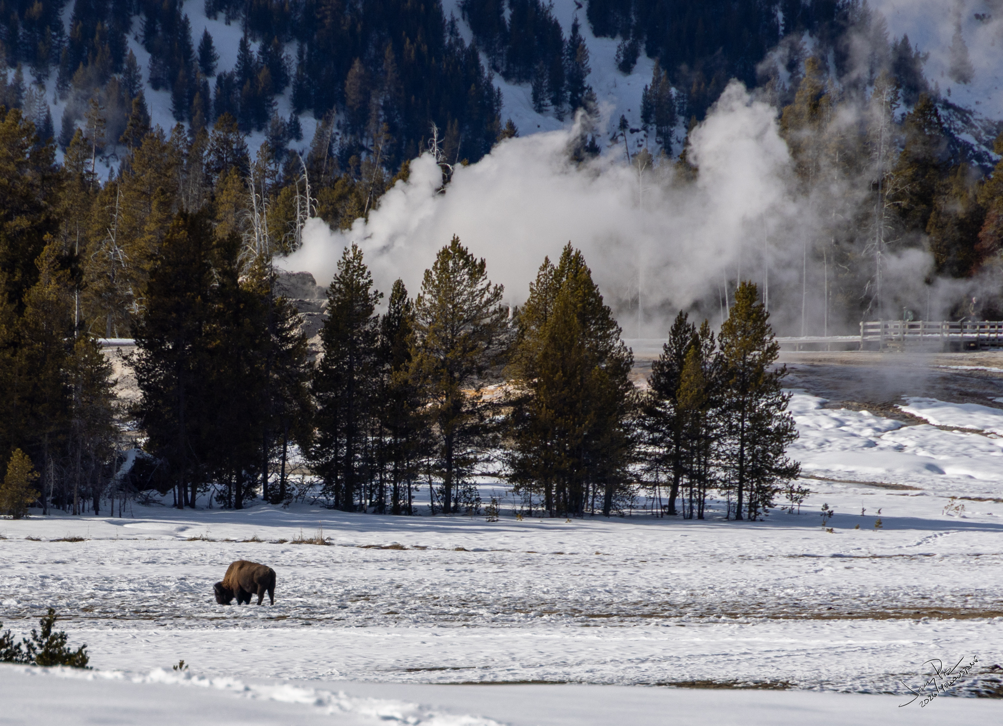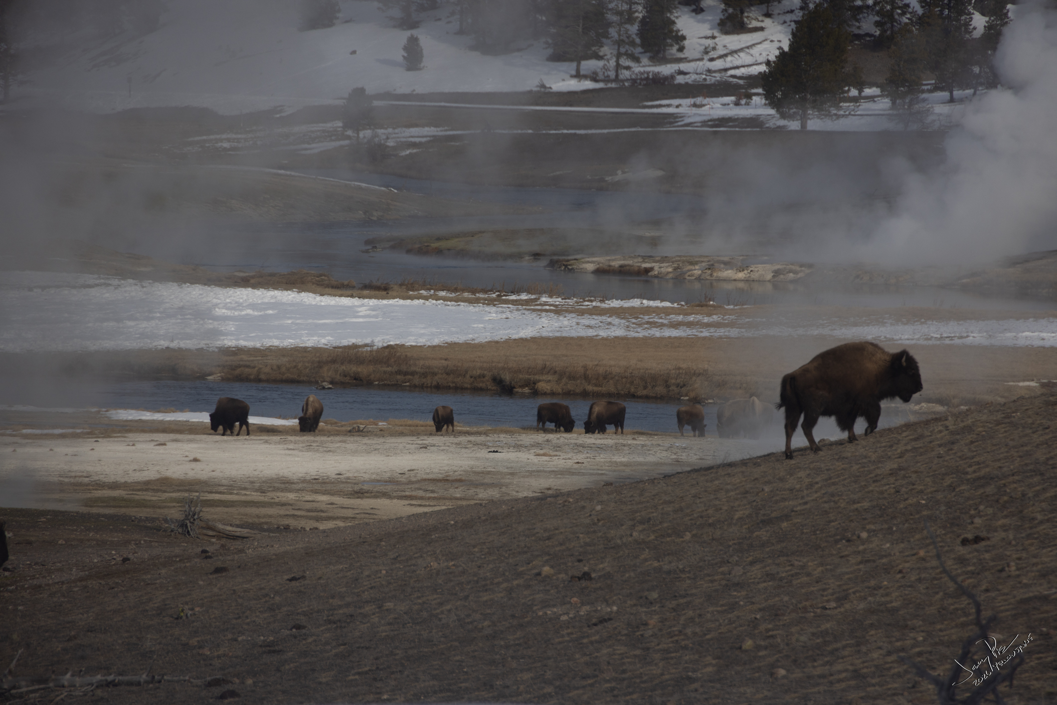 Barbara and I went out for a longer walk before dinner. Went to Castle Geyser and found a number of random buffalo all around the geysers. We kept our distance, but took their pictures.