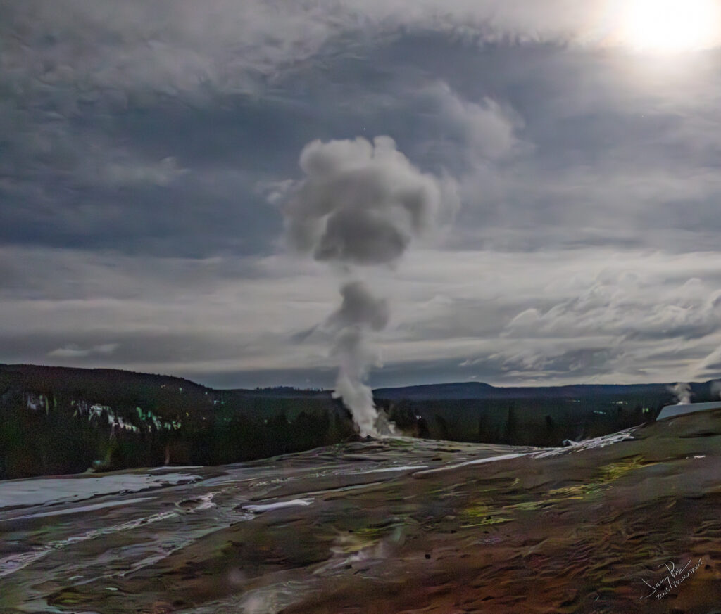 We went out after dinner to see old faithful in the moonlight. We had no clue when the next eruption would be, so we just took pictures of the steam then headed back to the room.