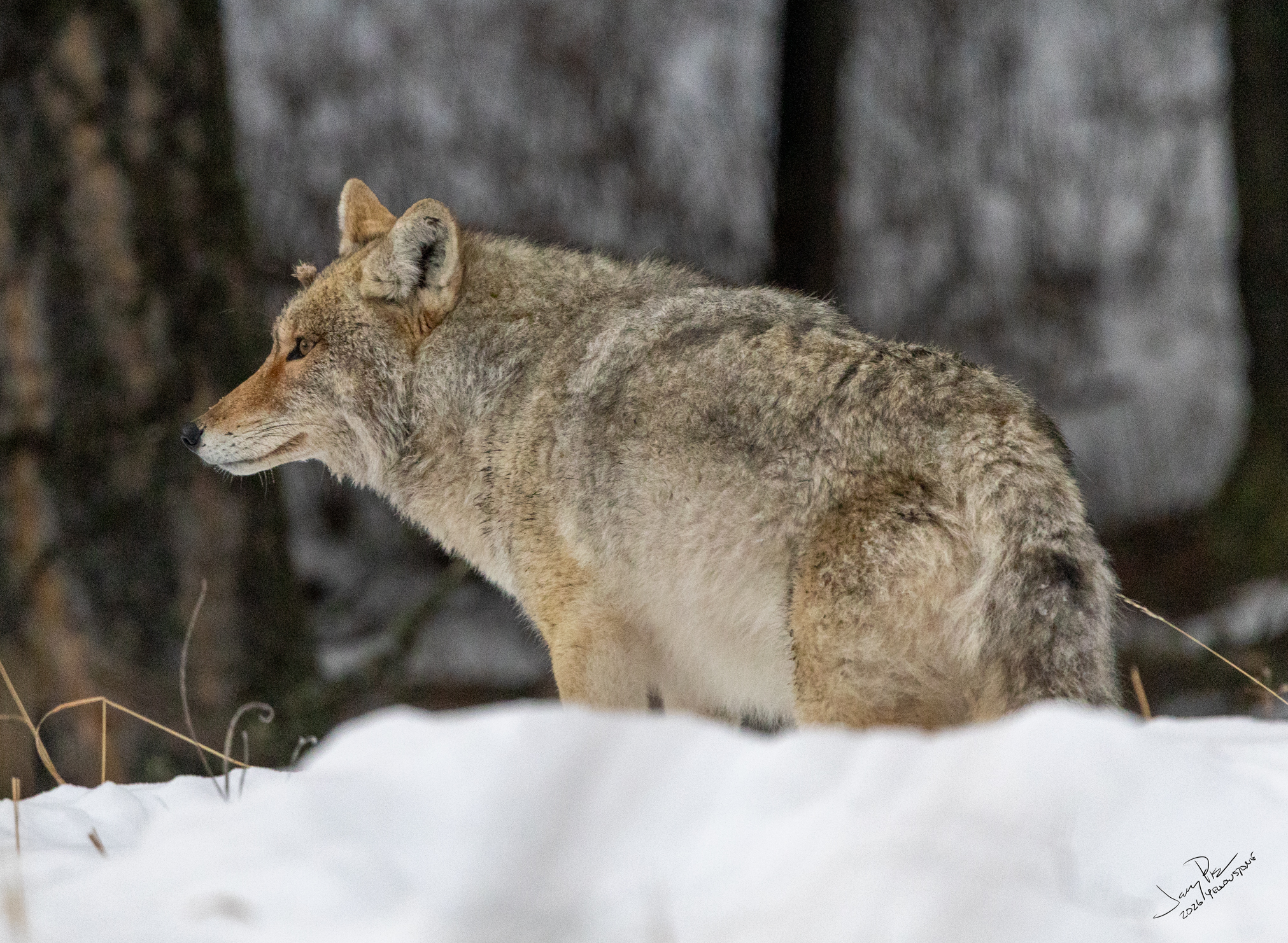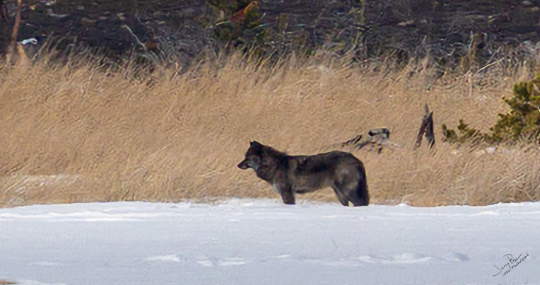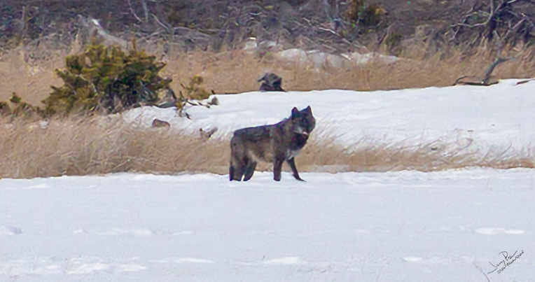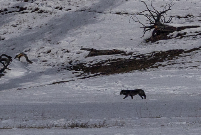 This turned out to be our only wolf sighting of the trip. I quickly learned that a typical wolf sighting was VERY far away – maybe a mile away? While I brought a long lens (500mm) it would have been much better with a 1000mm lens. It also would have been better with a good tripod with fine pointing controls. Next time!