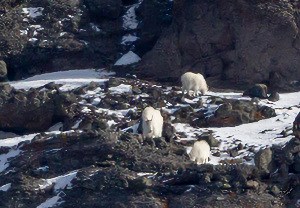 We had lunch at a spot where we met Cinna for hot drinks and sandwiches. It was a known place to see mountain goats on the hillside. She had them in her scope and the rest of us tried to find them on the hill. Not visible to the naked eye and even with my big lens not very clear. Some small white cotton balls on the hillside. But it counts that we saw them.