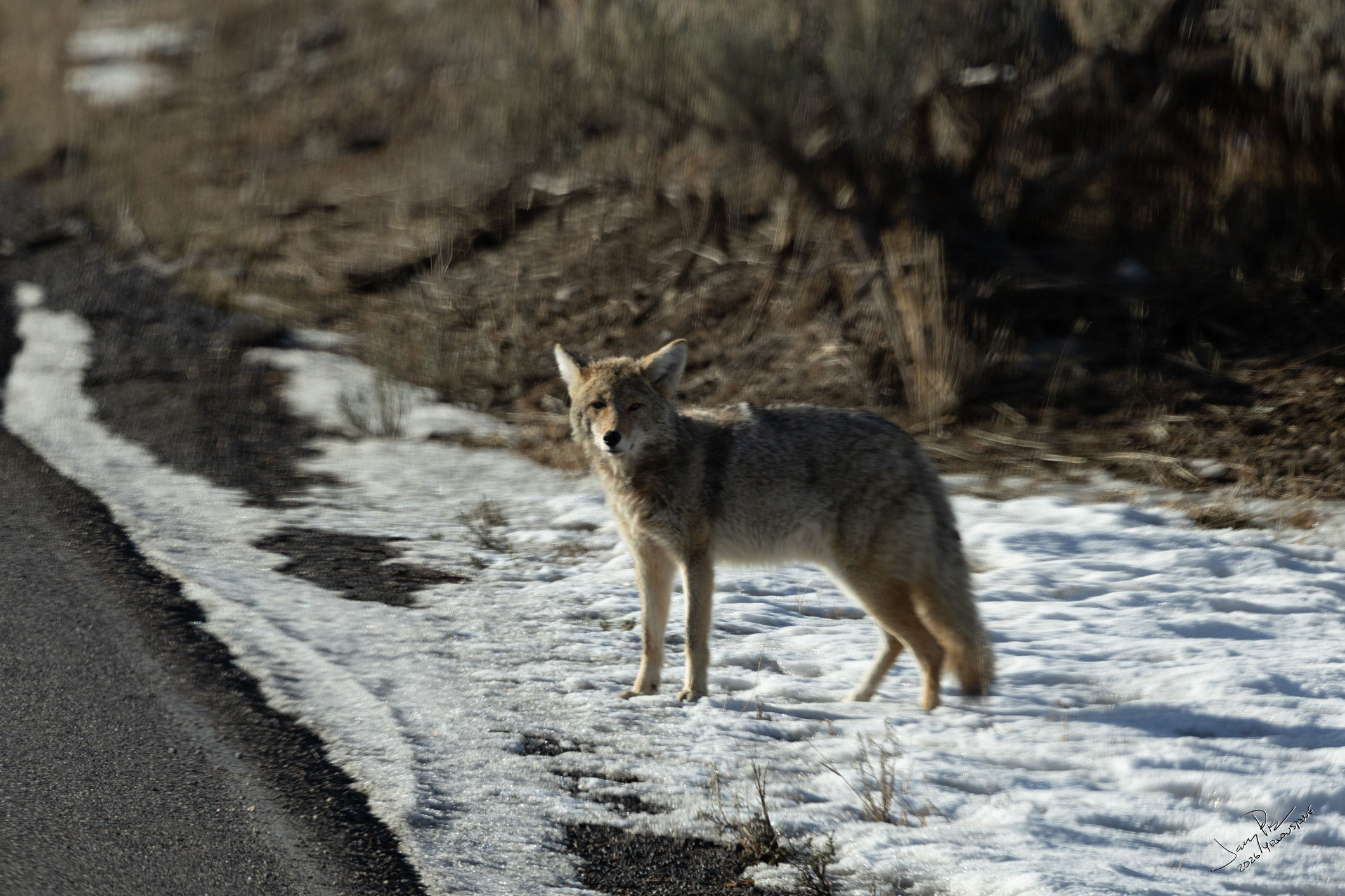 This coyote seemed to be confused about his role in the park.